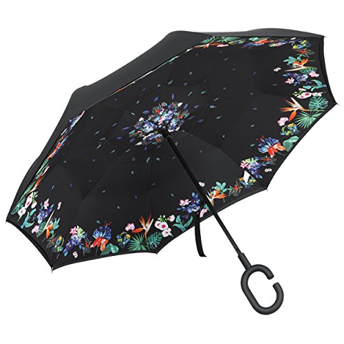 Plemo Inverted Umbrella uniquely combines a strong umbrella frame with pure aesthetic beauty, providing you with power and grace, all in a single package. Whether you are looking for a sturdy umbrella that can resist any bad weather or a sophisticated accessory for everyday life, we've got you covered! Stylish & Unique Printed with a stunning flowers design on its interior, this adorable umbrella will surely cheer you up in any dismal weather. The unusual reverse design is able to prevent the umbrella from flipping inside out and you from getting dampened by raindrops on the canopy. The specially made C-shape handle not only provides a much more secure grip, but also frees your hands to hold other objects. If you're carrying groceries, a purse, a briefcase, or a child in one hand, it's handy to be able to snap your umbrella around your arms for reliable protection. Sturdy & Durable With a double layer canopy (fabric density reaches 210T), fiberglass ribs and carbon fiber shaft, this umbrella firmly offers a generous 45.7 inches / 116 cm of coverage in heavy rains and gusting winds. This umbrella seamlessly combines classic elegance with modern, engineered technology. Having gone through complicated processing and testing, it can survive repeated opening and closing without any problems and will surely cheer you up in any bad weather conditions.
