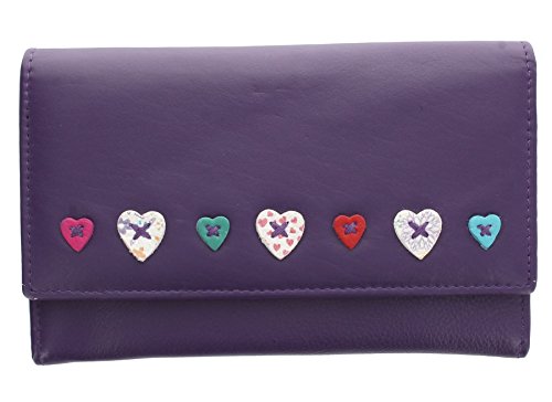 Soft leather ladies purse with applique heart detailing 16cm x 9cm x 2.5cm. 8 credit card slots and 2 credit card sized slip pockets for extra cards. ID / photograph window. 4 further slip pockets of which one is a transparent window. 2 note sections and a large zipped central coin pocket. The purse features heart shaped zip pullers and is blind embossed on the inside with the Mala Leather logo. Zipped back pocket also suitable for coins. The purse is secured with a dual position press stud fastening and is supplied with presentation dustbag matching the interior lining.